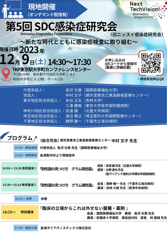 弊社は2023年4月から島津製作所グループの一員となり、社名を日水製薬から島津ダイアグノスティクス(SDC:Shimadzu Diagnostics Corporation)に変更しております。この度、2019年から開催しておりました「ニッスイ感染症研究会」から名称を「SDC感染症研究会」に改め、2023年12月9日(土)に開催いたします。