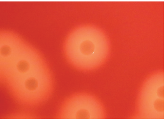 | β溶血 | コロニーの周囲が明瞭な境界を持つ透明な溶血環![]() | Streptococcus pyogenes |