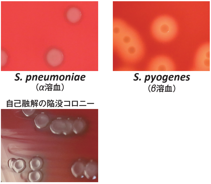 | α溶血 | コロニーの周囲が緑変![]() | Streptococcus pneumoniae |