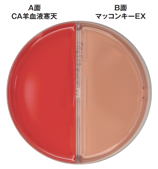 1枚のプレートに2種類の培地が分注された製品です。