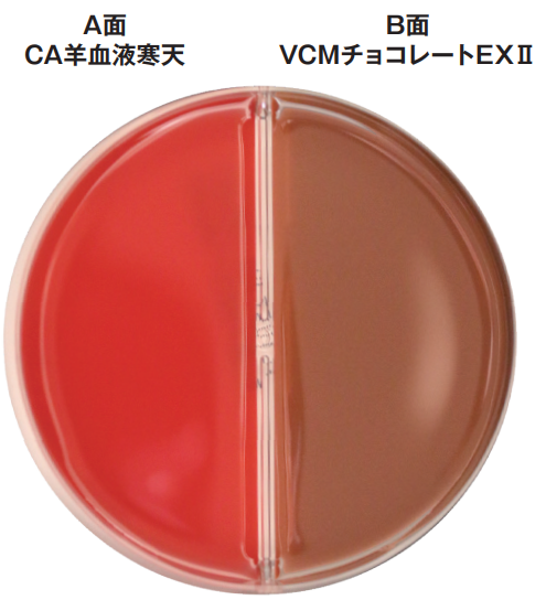 | 基礎培地にトリプトソーヤ寒天培地を用い、ヒツジ脱繊維血液を5%と発育因子を加えた培地 | ゴノコッカス(GC)寒天基礎培地にヘモグロビン末とCLSI M22-A3発育因子を加え、発育支持力を強化した培地 |